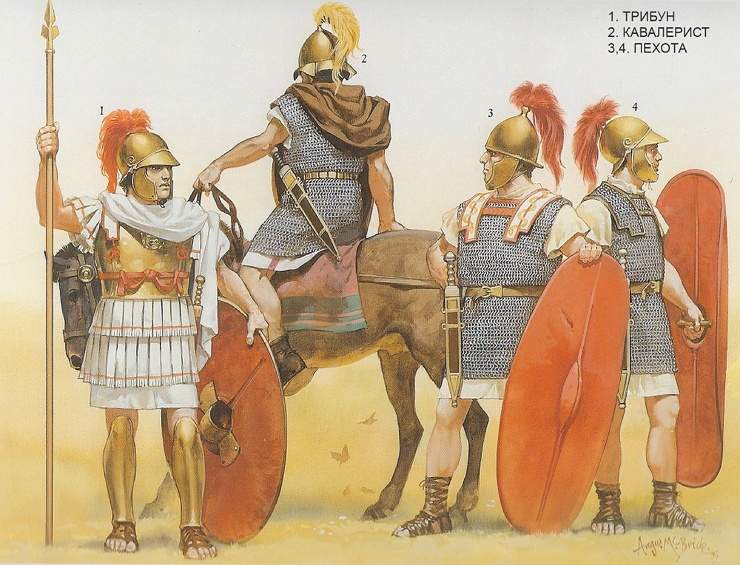 Доспехом почти повсеместно стала лорика хамата — кольчуга с наплечниками на крючках. Естественно, под ней был поддоспешник. Голову прикрывал шлем типа монтефортино, чаще всего бронзовый. Он имел нащечники, иногда небольшой назатыльник, а наверху — шишку, куда вставлялись перья или конский волос. Ноги закрывали поножи.